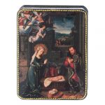 Russische Lackdose aus Papiermaché, Motiv: Geburt Christi nach David, im Fedoskino-Stil, 11x8 cm. Stilisierte Reproduktion nach dem Bild "Die Geburt Christi" des holländischen Meisters Gerard David.
