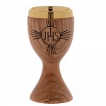 Cáliz olivo madurado Asís IHS. Cáliz de madera de olivo de Asís con IHS realizado completamente a mano por un artesano italiano. Este cáliz es una auténtica obra maestra gracias a las venas maravillosas de la madera y a los metales dorados de calidad de la copa.