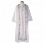 Las telas van desde el algodón hasta el poliéster, el color es casi siempre blanco, en todas sus tonalidades, desde el marfil hasta el blanco hielo. Los bordados ofrecen una amplia gama de variaciones, desde los simples bordes dorados que adornan el dobladillo del vestido y las mangas, hasta bordados más complejos, en forma de cruz, por ejemplo, que ocupan todo el cofre. Algunos de nuestros vestidos para la Primera Comunión también están enriquecidos por un escapular, la tira de tela con una abertura para la cabeza, apoyada en el pecho y en la parte posterior, que los que pertenecen a algunas órdenes religiosas llevan sobre sus vestimentas sacerdotales, bordeado con oro o decorado con bordado. Otros tienen elementos decorativos adicionales, como este modelo, enriquecidos por una estola bordada en oro en la que se borda una cruz de nido de abeja. Otros tienen los bordes embellecidos con galones, pasamanerías con forma de cinta aplastada hecha de hilos de seda, hilos entrelazados, generalmente dorados o rojos.