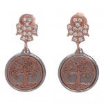 Boucles oreilles en argent 925 AMEN ange et Arbre de la Vie. Boucles d'oreilles pendentifs avec médaille représentant l'Arbre de la Vie en finition rosé sur cercle rhodié avec clou décoré d'un ange avec zircons blancs. Modèle en argent 925 rosé et rhodié de 12 mm de diamètre avec arrêts-piercing, réalisé en Italie par une entreprise spécialisée.