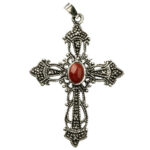 Dal design antico le splendide Croce argento 800 con al centro un tondo in corallo e la magnifica Croce pendente in Argento brunito traforata con ovale centrale in corallo rosso, tutte lavorate a mano.