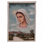 Arazzo da parete con la raffigurazione della Madonna di Medjugorje; paesaggio sullo sfondo. Realizzato in tessuto jacquard rifinito a mano e interamente realizzato in Italia.