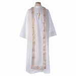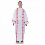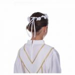 Las telas van desde el algodón hasta el poliéster, el color es casi siempre blanco, en todas sus tonalidades, desde el marfil hasta el blanco hielo. Los bordados ofrecen una amplia gama de variaciones, desde los simples bordes dorados que adornan el dobladillo del vestido y las mangas, hasta bordados más complejos, en forma de cruz, por ejemplo, que ocupan todo el cofre. Algunos de nuestros vestidos para la Primera Comunión también están enriquecidos por un escapular, la tira de tela con una abertura para la cabeza, apoyada en el pecho y en la parte posterior, que los que pertenecen a algunas órdenes religiosas llevan sobre sus vestimentas sacerdotales, bordeado con oro o decorado con bordado. Otros tienen elementos decorativos adicionales, como este modelo, enriquecidos por una estola bordada en oro en la que se borda una cruz de nido de abeja. Otros tienen los bordes embellecidos con galones, pasamanerías con forma de cinta aplastada hecha de hilos de seda, hilos entrelazados, generalmente dorados o rojos.